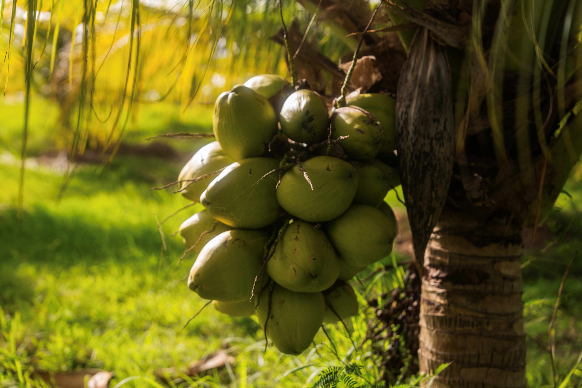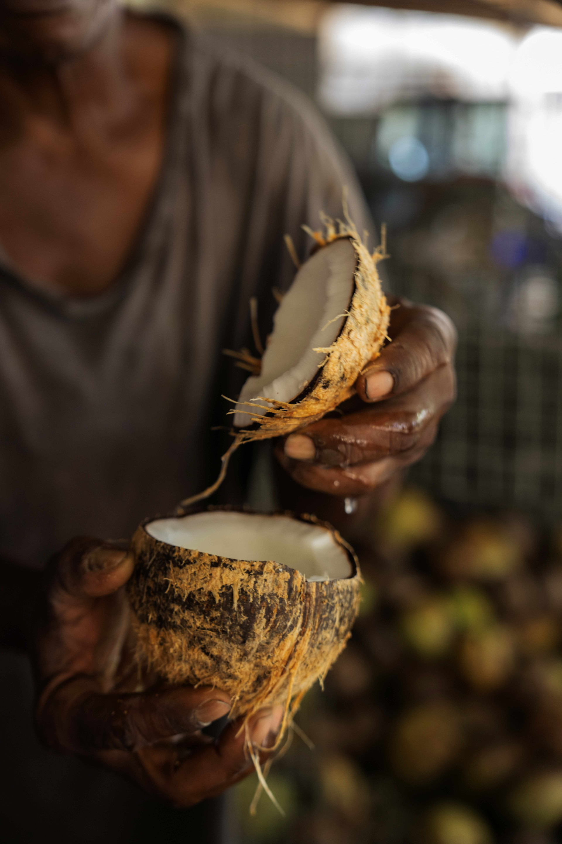 Les noix de coco mettent jusqu’à 12 mois pour arriver à maturité, développant une coque brune autour d’une chair dense et blanche.